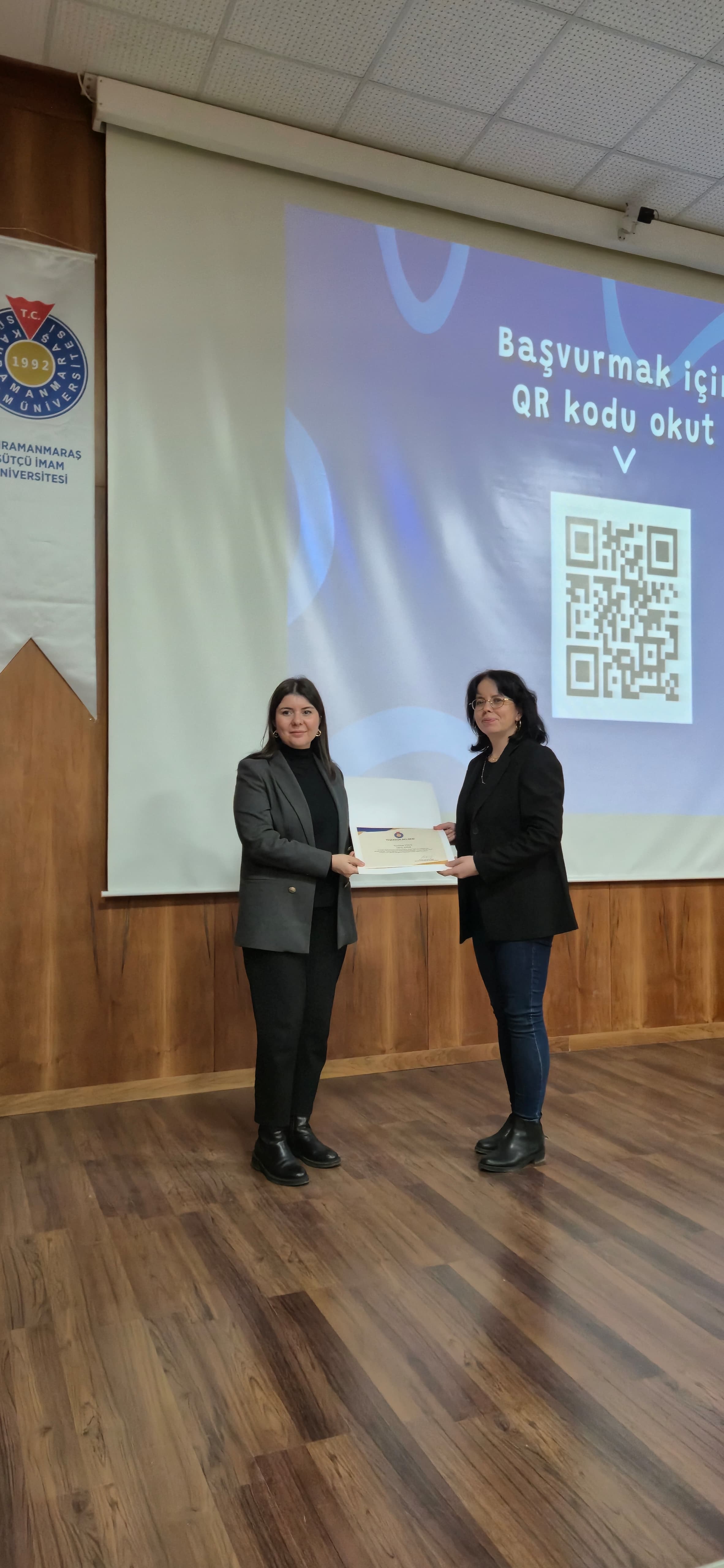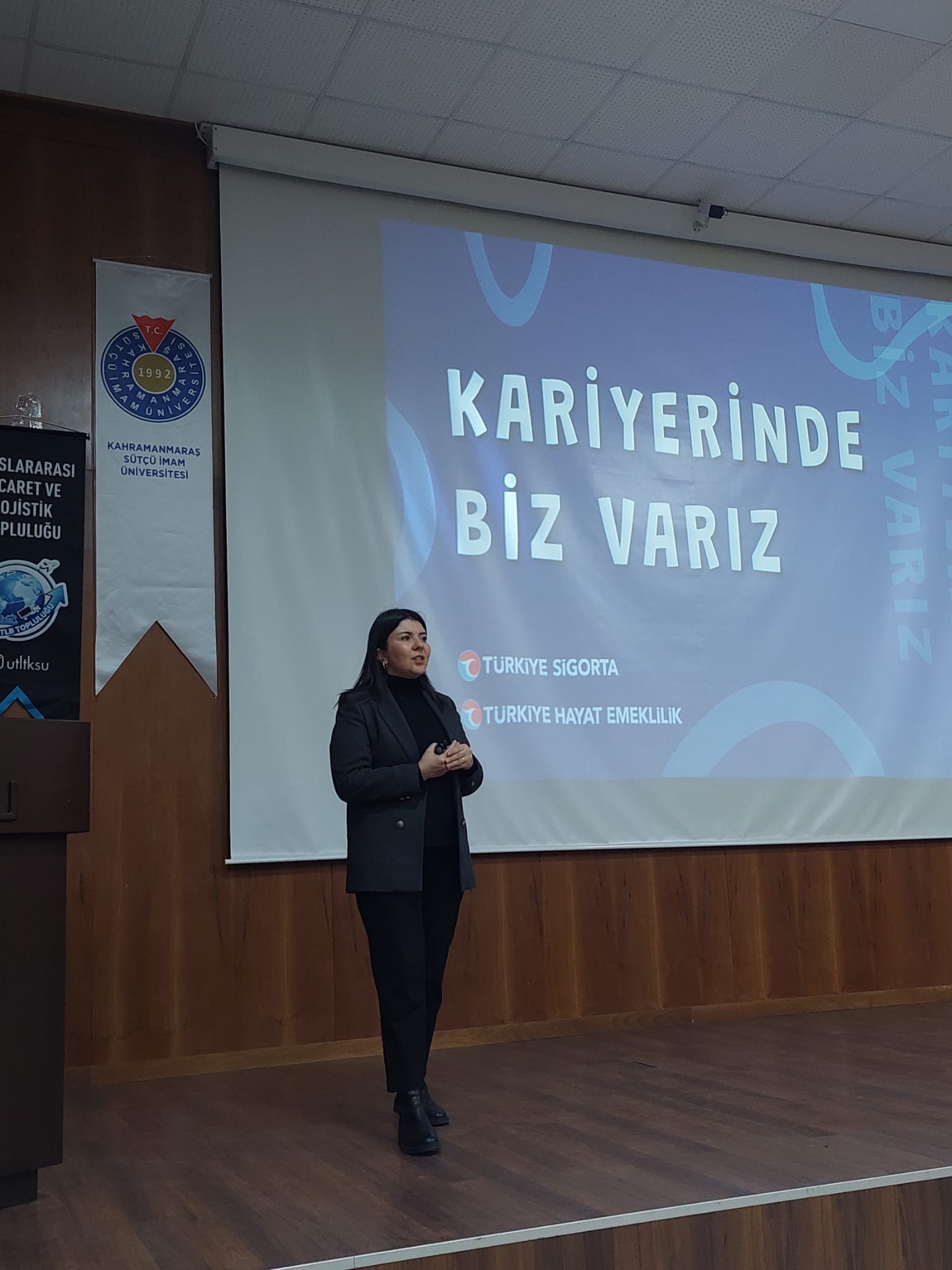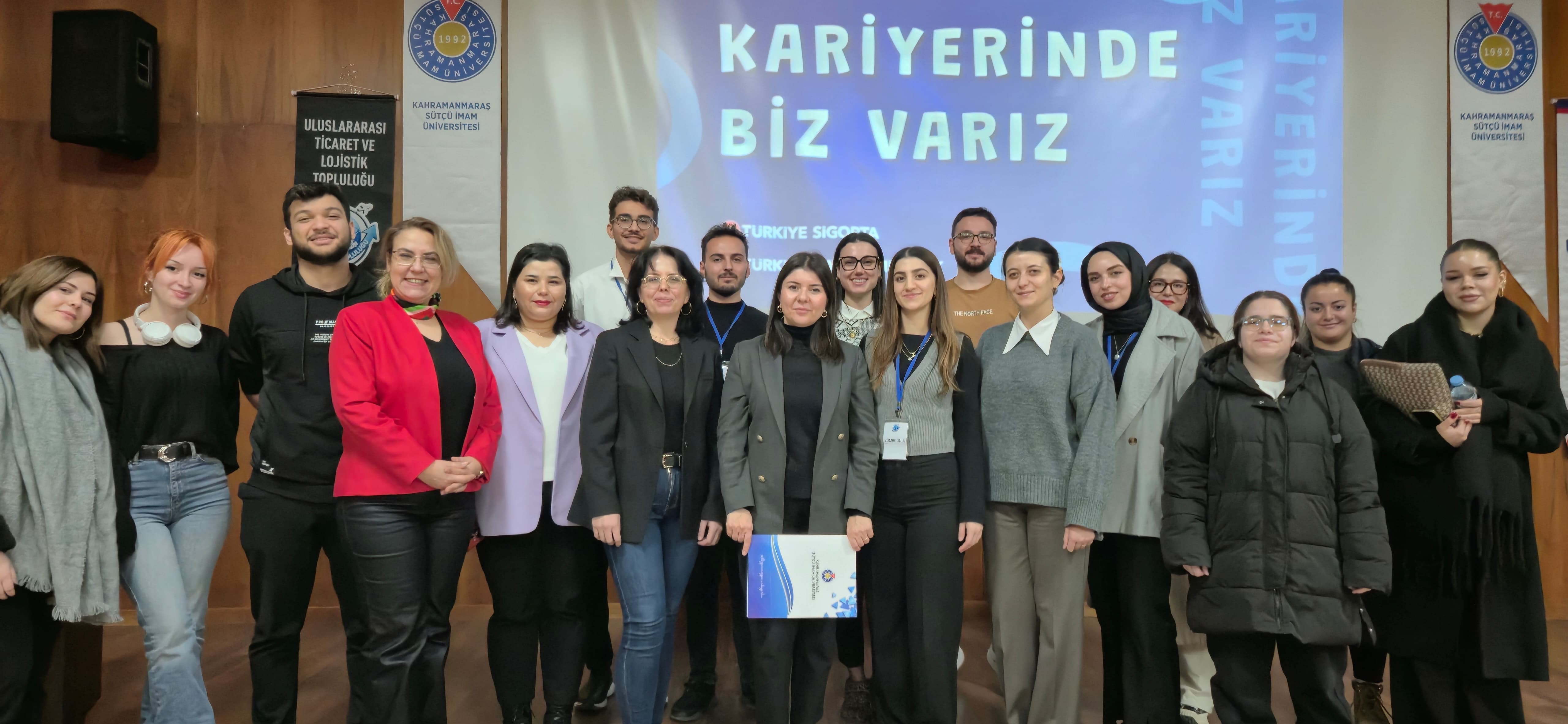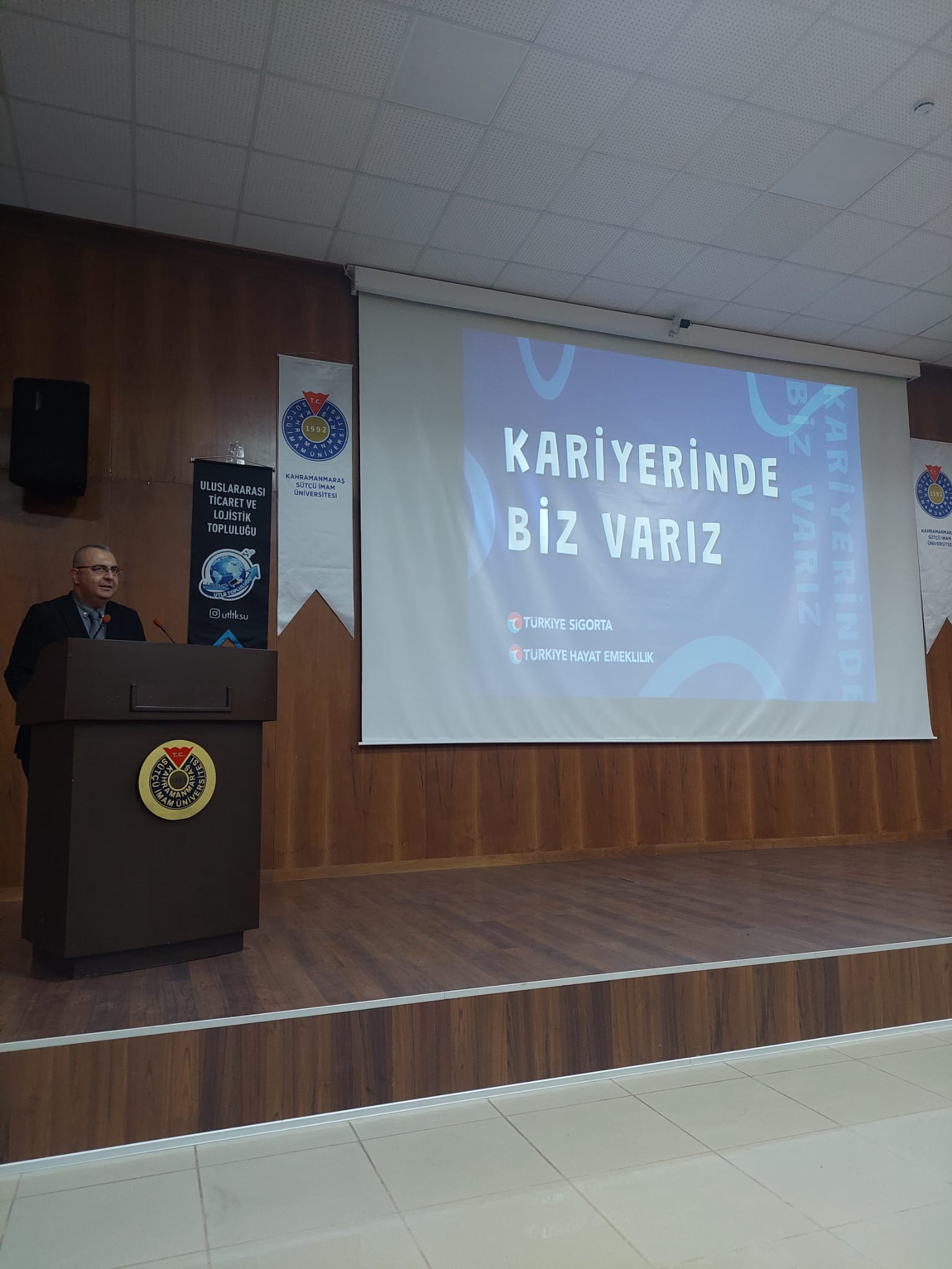 Türkiye Sigorta ve Türkiye Hayat Emeklilik ile KSÜ İktisadi ve İdari Bilimler Fakültesi, Uluslararası Ticaret ve Lojistik Bölümü, ULTİMER ve Uluslararası Ticaret ve Lojistik Bölümü Topluluğu işbirliği ile 16 Aralık 2025 Saat:13:30’da Türkiye Sigorta’nın “Kariyerde Biz Varız” Program tanıtımı gerçekleştirildi. Program kapsamında öğrencilere 2025-2026 Eğitim Öğretim Döneminde gerçekleştirilecek Yapay Zekâ, Finansal Okuryazarlık, Proje Yönetimi gibi Sertifikalı eğitimlerin bilgileri verildi.