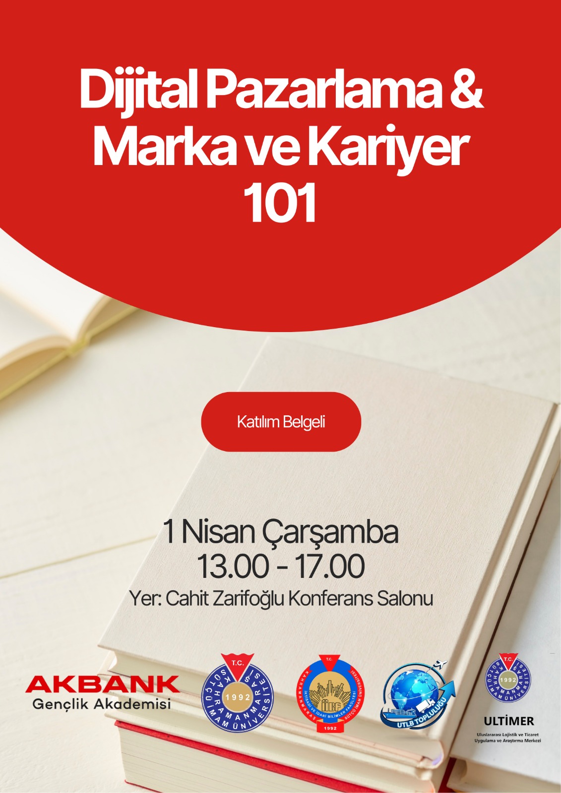 İktisadi ve İdari Bilimler Fakültesi, Uluslararası Ticaret ve Lojistik Bölümü, Uluslararası Lojistik ve Ticaret Uygulama ve Araştırma Merkezi (ULTİMER) ve Uluslararası Ticaret ve Lojistik Öğrenci Topluluğu ile Akbank iş birliği ile 01.04.2026 tarihinde saat:13:00-17:00 arasında Cahit Zarifoğlu Konferans salonunda Akbank tarafından yürütülen “Kampüs 101” programı kapsamında “Dijital Pazarlama & Marka Yönetimi ve Kariyer” eğitimi gerçekleşecektir. Dijital Pazarlama & Marka Yönetimi ve Kariyer eğitimine katılmak için aşağıdaki formu dolduran öğrencilere Akbank tarafından hediye verilecek ve Linkedin’e uyumlu dijital katılım belgesi verilecektir.https://forms.gle/zqvG2gQHV3wBtymU7