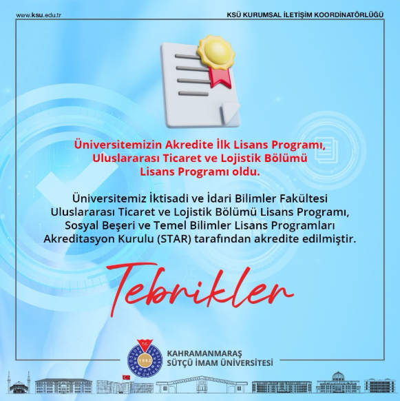 Kahramanmaraş Sütçü İmam Üniversitesi (KSÜ), akademik kalite ve eğitim standartlarını güçlendirme yolunda önemli bir eşiği daha geride bıraktı. Sosyal Beşeri ve Temel Bilimler Lisans Programları Akreditasyon Kurulu, 11.03.2026 tarih ve 22 no.lu kararıyla KSÜ İktisadi ve İdari Bilimler Fakültesi Uluslararası Ticaret ve Lojistik Bölümü Uluslararası Ticaret ve Lojistik lisans programını akredite etti.