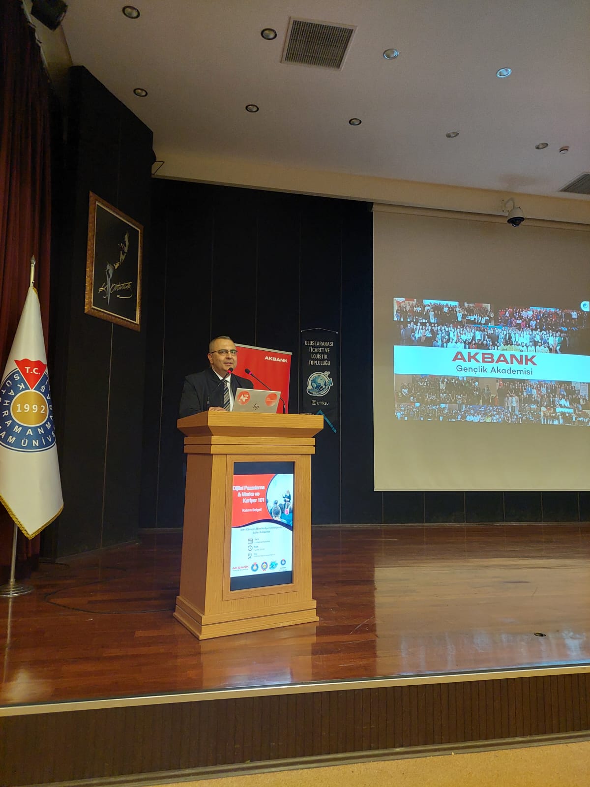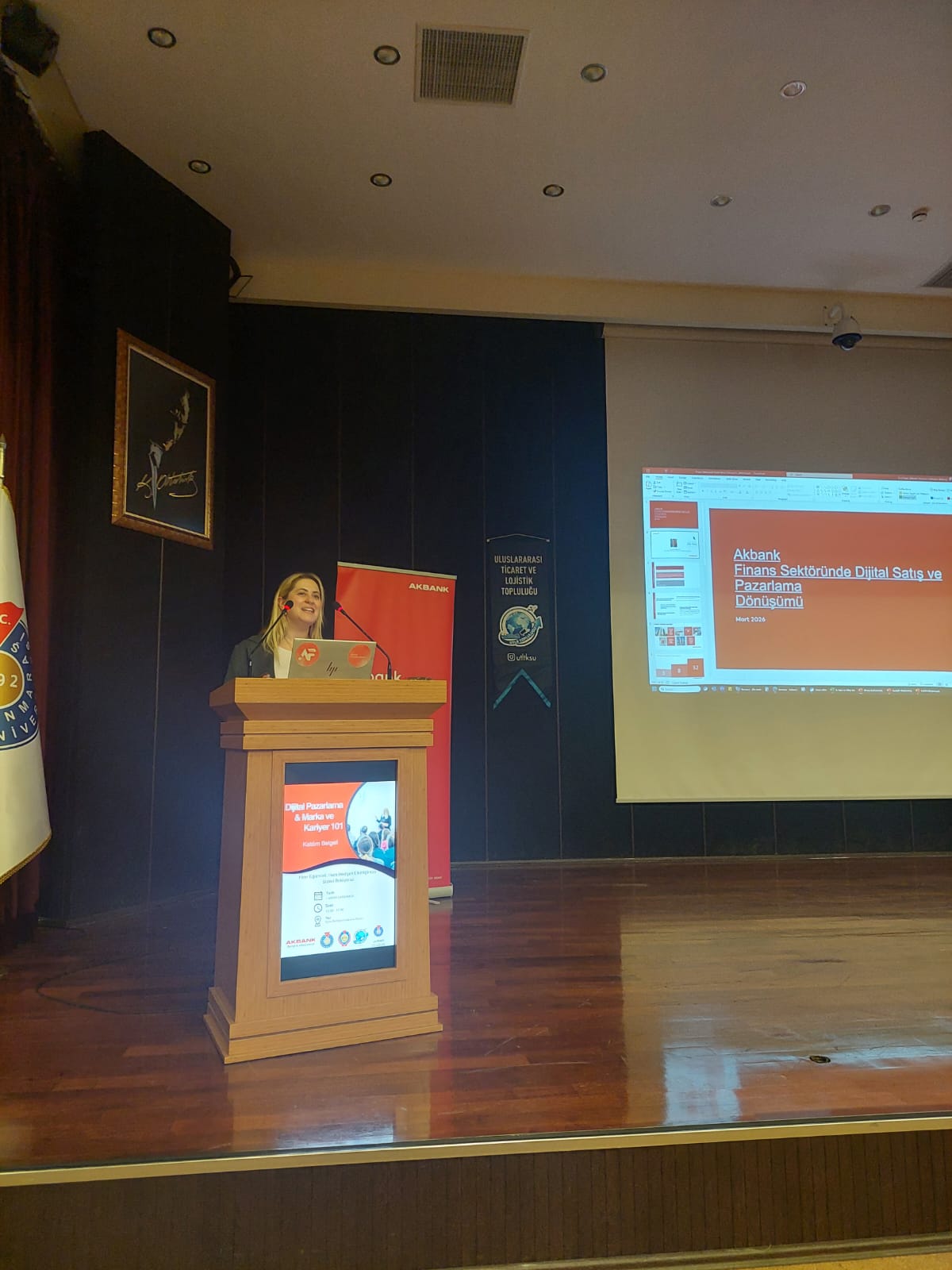 İktisadi ve İdari Bilimler Fakültesi, Uluslararası Ticaret ve Lojistik Bölümü, Uluslararası Lojistik ve Ticaret Uygulama ve Araştırma Merkezi (ULTİMER) ve Uluslararası Ticaret ve Lojistik Öğrenci Topluluğu ile Akbank iş birliği ile 01.04.2026 tarihinde saat:13:00-17:00 arasında Cahit Zarifoğlu Konferans salonunda Akbank Gençlik Akademisi tarafından yürütülen “Kampüs 101” programı kapsamında “Dijital Pazarlama & Marka Yönetimi ve Kariyer” eğitimi gerçekleştirildi.